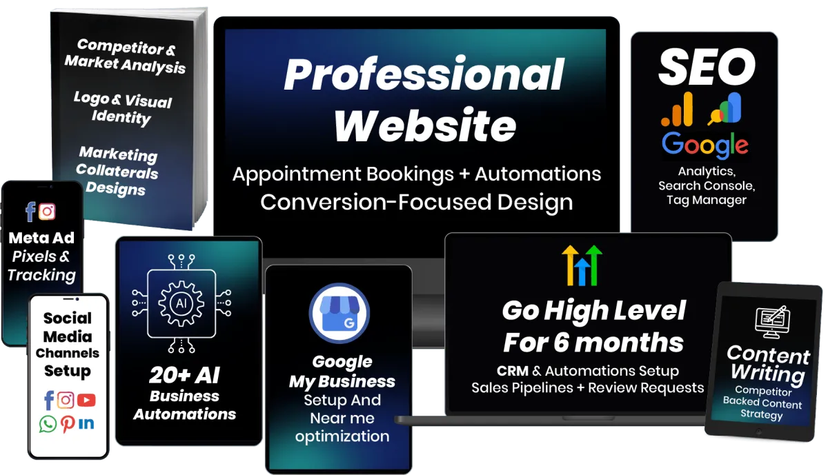A fully optimized website (10–12 pages), Along with SEO trackings done plus CRM system with automations, pipelines, and booking tools — so you capture and convert clients on autopilot.